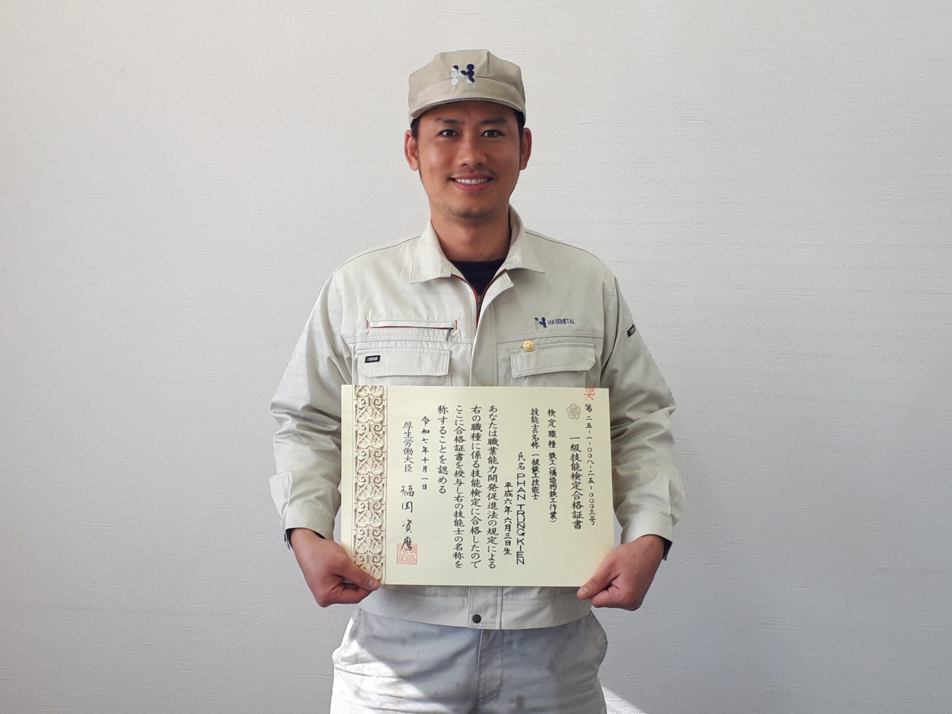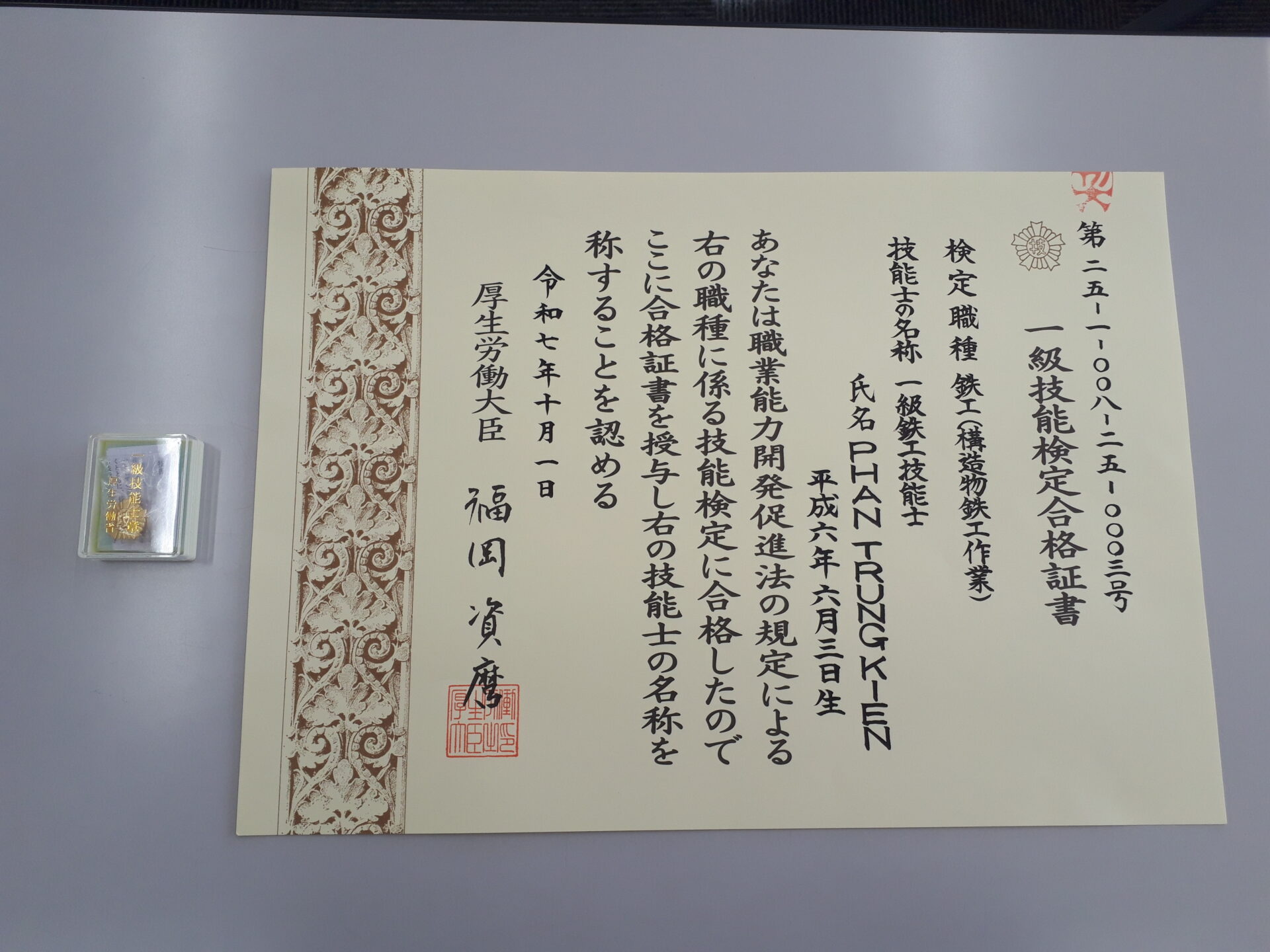 当社社員のファン チュン キエンくんが一級技能検定(鉄工)に見事合格しました!